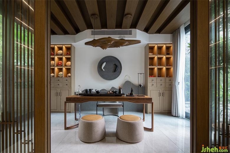 茶室的靜謐給業(yè)主一個(gè)自我思考的空間,這個(gè)品茶的空間在本案是一個(gè)亮點(diǎn)設(shè)計(jì)。別墅裝飾左右采光,能看見花園的風(fēng)景,十分有格調(diào)??臻g大面積采用木質(zhì)裝飾,桌子、柜子、門、燈、吊頂營造著古典氣質(zhì)。