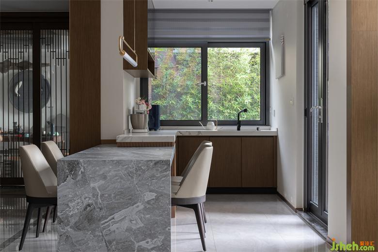 空間設(shè)計(jì)講究在日常生活中顯示品位與品質(zhì),餐廳背后用兩個(gè)儲(chǔ)物柜,別墅裝飾了展示的區(qū)域,方便業(yè)主藏酒展示,在節(jié)日聚餐中方便拿取,為空間提升檔次。