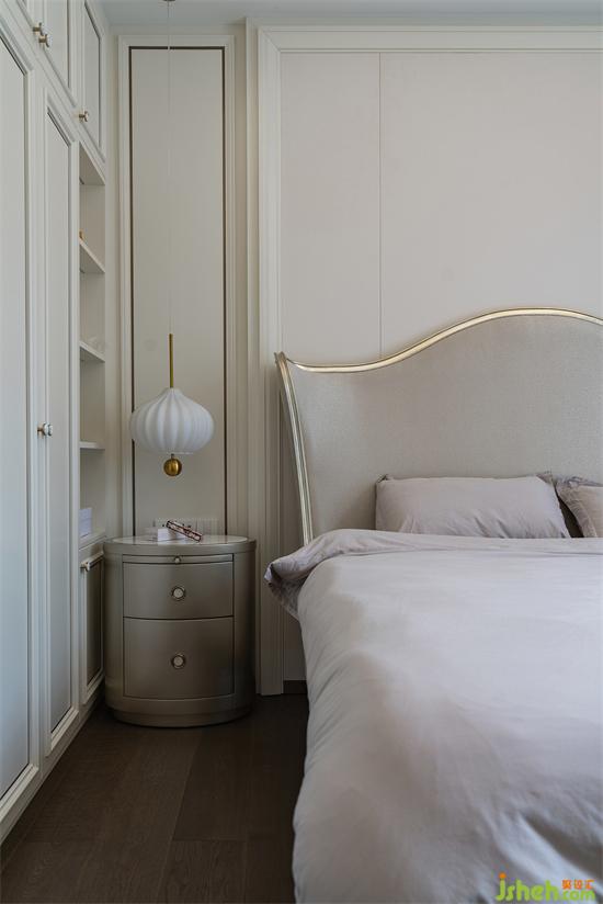白色系兒童房為孩子打造了一個溫暖的童話世界,弧形吊頂增添裝飾性,定制衣柜特意設計了展示區(qū)域,裝下公主的心愛之物,兩邊對稱的吊燈營造著夢境。