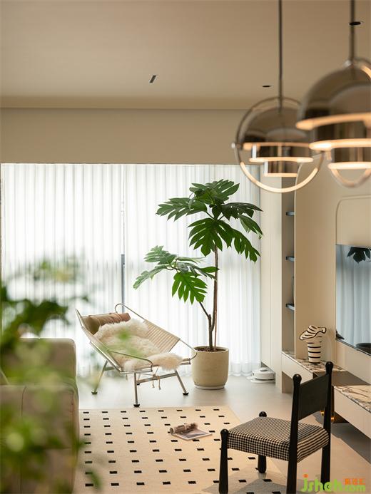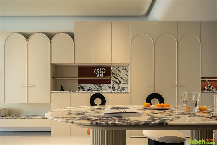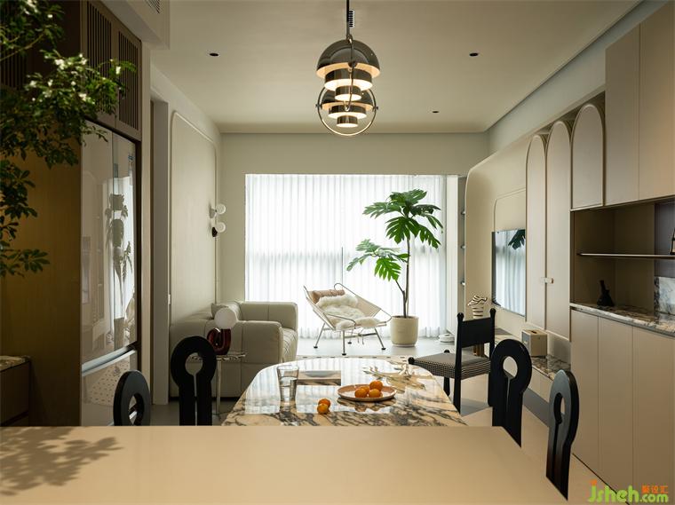 2、餐廳與公衛(wèi)之間做s形墻,使餐廚一體化且擴(kuò)大整個(gè)空間的比例。