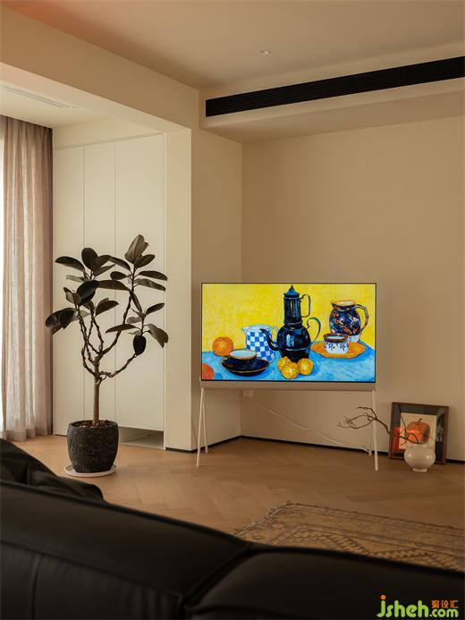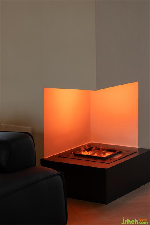 2、巧妙利用陽臺包柱空間打造壁爐裝飾,增加客廳氛圍感與設(shè)計(jì)亮點(diǎn)。