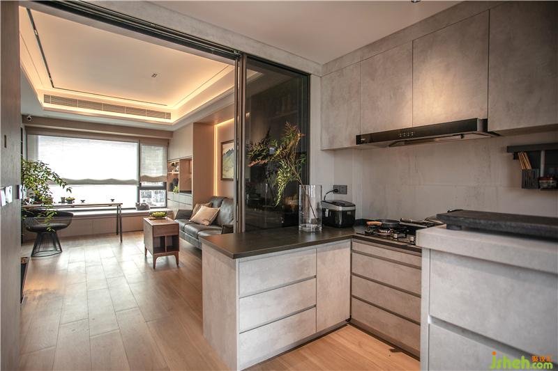 入戶便是廚房,與客廳相接。為了避免廚房油煙竄進(jìn)客廳,所有便在在廚房與客廳之間加裝上一道啡色自動門。做飯的時候,把門關(guān)上,避免油煙飄到客廳。平時便是打開的狀態(tài)。