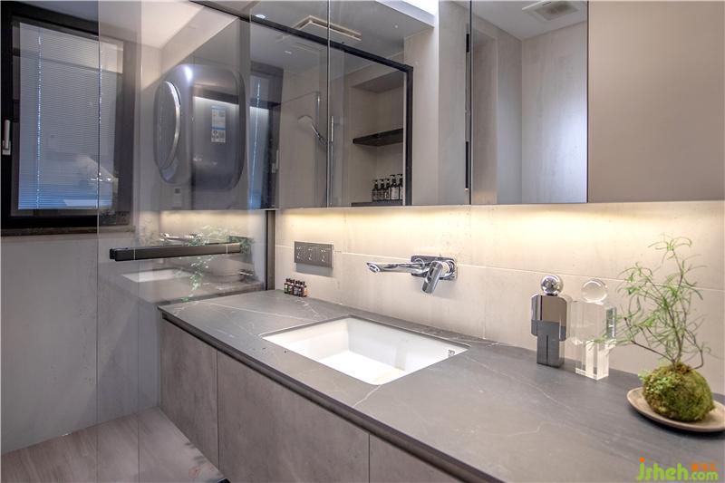 公衛(wèi)的格調(diào)與房子的整體設(shè)計(jì)保持一致,干凈舒適。暖調(diào)燈光,照出年輕好氣色。同時(shí)主人愛藏物的小心思再次體現(xiàn),上有三開鏡柜,下有三開梳洗臺(tái)柜,再多的物品皆可收納。