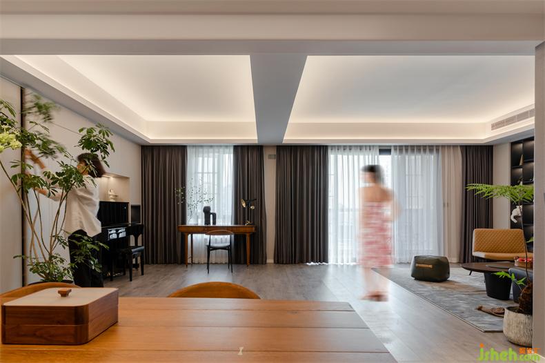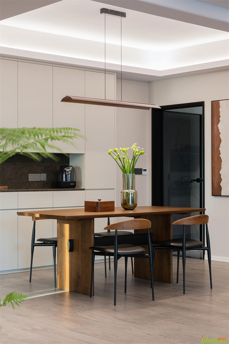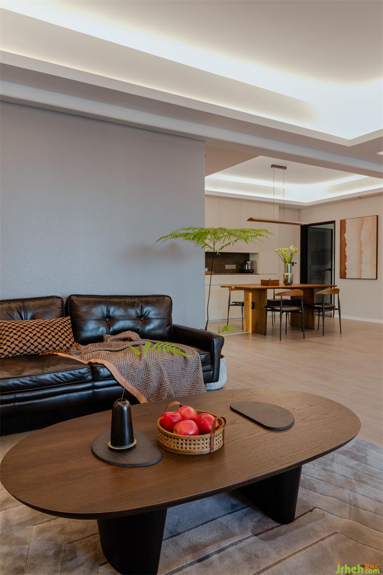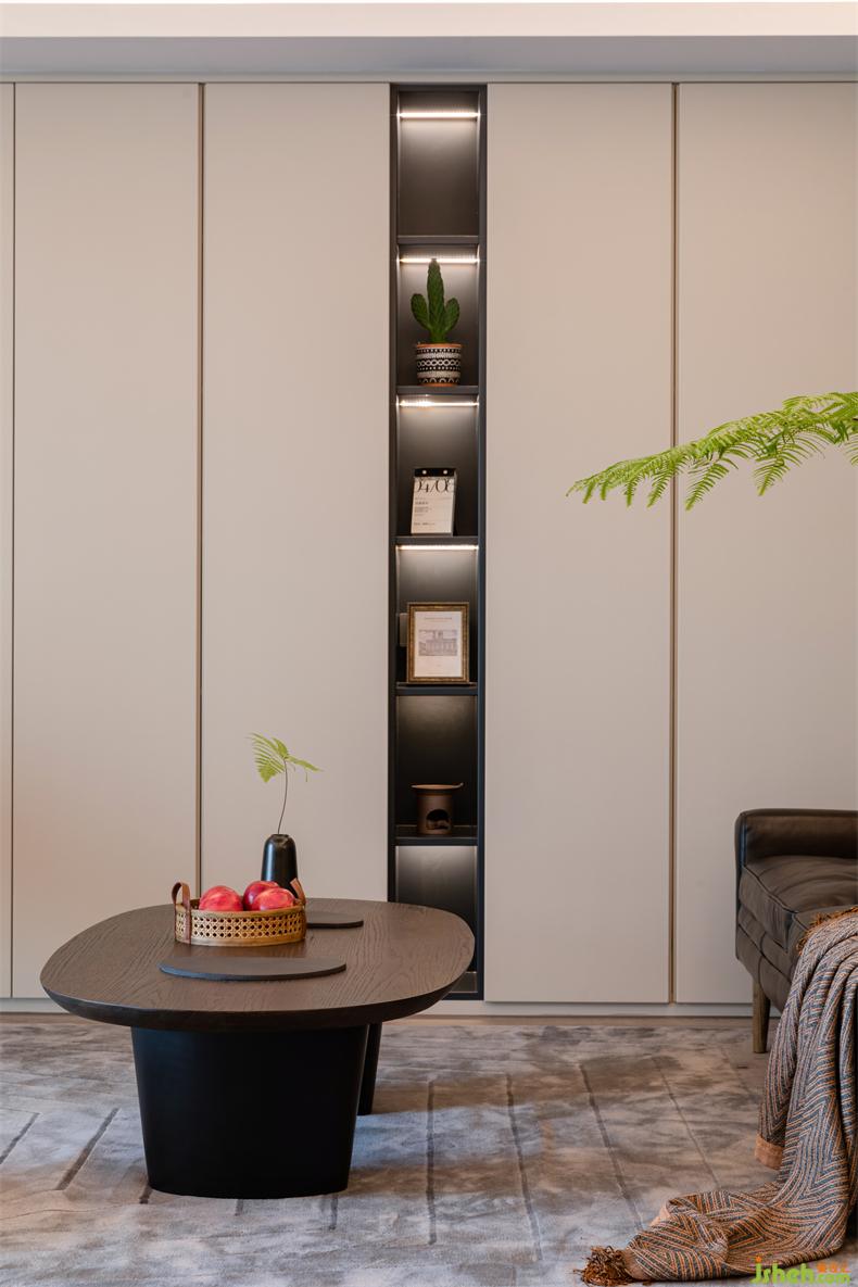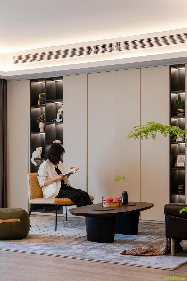 放棄電視墻、包圍式簇?fù)淼目蛷d,室內(nèi)設(shè)計(jì)師在棕、綠點(diǎn)綴的柔和色調(diào)中,充滿了簡(jiǎn)單素雅、自然又自在的生活氣息。在此基調(diào),收納柜整合著雜亂無(wú)序的物件,搭配簡(jiǎn)約主義的家具,協(xié)同材質(zhì)、線條、光影與細(xì)節(jié),帶給空間質(zhì)樸的舒適感而無(wú)可比擬。