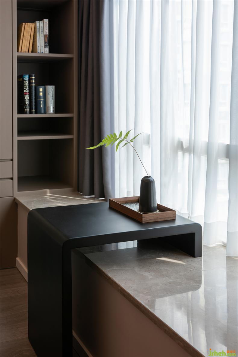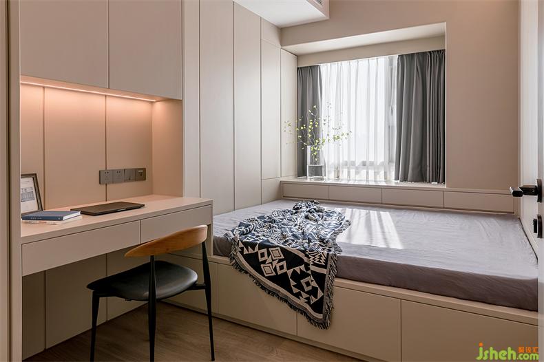 以簡(jiǎn)雅為韻調(diào)鋪墊的主臥,室內(nèi)設(shè)計(jì)師形室內(nèi)設(shè)計(jì)師式極簡(jiǎn)但功能一應(yīng)俱全??臻g材質(zhì)跟隨光影靈動(dòng),漸入到平和的氛圍中??梢苿?dòng)的窗臺(tái)茶幾、復(fù)古的梳妝臺(tái)桌把簡(jiǎn)約主義和實(shí)用主義的特點(diǎn)綜合,就像隱藏式的衣帽柜,打開(kāi)即是使用,關(guān)上即是生活的藝術(shù)和美。