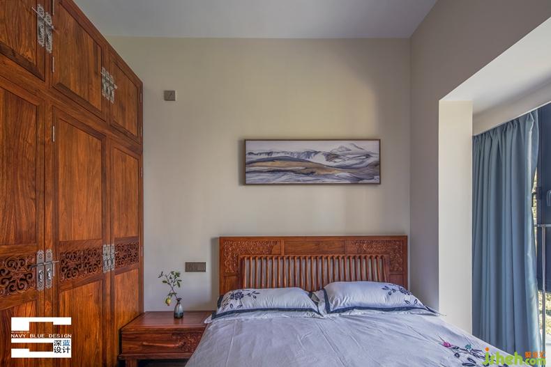 次臥:簡中有繁,繁中有簡;一席素色床榻,一側(cè)細雕繁木,而整個屋子的意境,最終都落入了一幅中式抽象畫里。