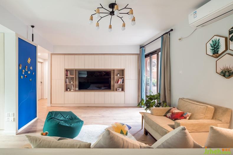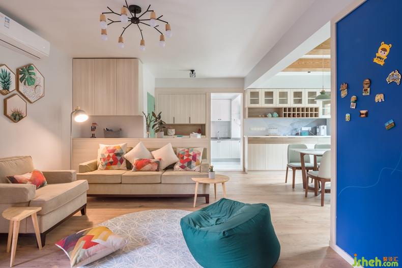 從門廳步入客廳,充滿絢麗色彩的空間傳達著這對年輕夫妻的熱情,富有無限活力的氛圍搭配不乏北歐小清新的干凈和明朗,以及令人忍不住想親近的木調(diào)作修飾,淡藍色調(diào)是空間里最美好的調(diào)色板,一股清涼,一種不俗的生活品味。室內(nèi)設(shè)計師
