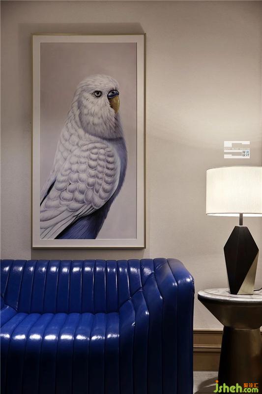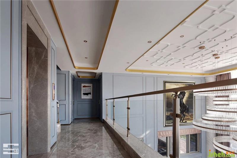 二層走廊大面積透明玻璃自樓梯口處延伸環(huán)抱,平靜且節(jié)制的展示方式增強了一樓與二樓之間的互動性,古堡灰地磚與跳躍黑馬圖案的金屬邊框掛畫相得益彰。我們通過材料連貫與區(qū)分,勾勒空間的韻律,營造出一番別致韻味,整體線條簡約流暢,干凈利落。
