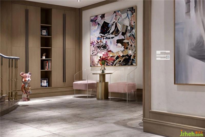 地下室門廳以淺色木飾面與米色墻面為基調,透明粉色絲絨座椅與金屬元素相配合,彰顯主人的優(yōu)雅品味,使空間更加舒適柔和;大幅彩色油畫與BR@RBRICK彩色積木熊相呼應,提升空間藝術感。