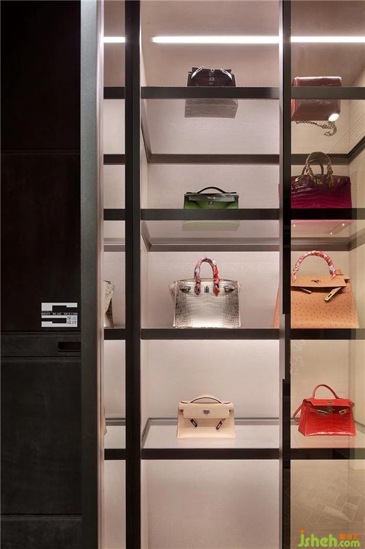 明亮的主臥與沉穩(wěn)暗黑的衣帽間形成鮮明對(duì)比。黑色布紋硬包的大衣柜充滿整個(gè)墻壁,大號(hào)BR@RBRICK積木熊屹立在轉(zhuǎn)角處,大型展示柜陳列著女主人的心頭大好----款式不一的Hermes包包,濃郁的輕奢感溢滿而出。走進(jìn)衣帽間,對(duì)鏡貼花黃,你就是這里的女王。