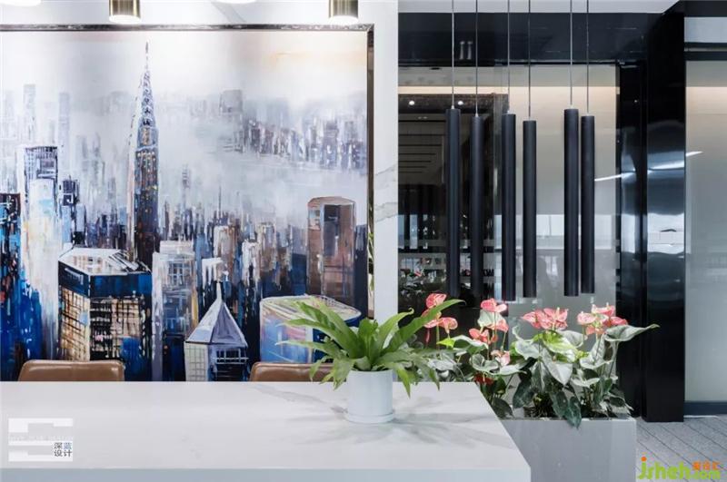 高低錯(cuò)落的形象墻有別于傳統(tǒng)的形象墻,既增加空間的亮度,又使沉穩(wěn)干練的空間多了份趣味;形象墻、綠植與北歐黑色吊燈,將休閑區(qū)與入門處分隔,起到一個(gè)隔斷的作用。