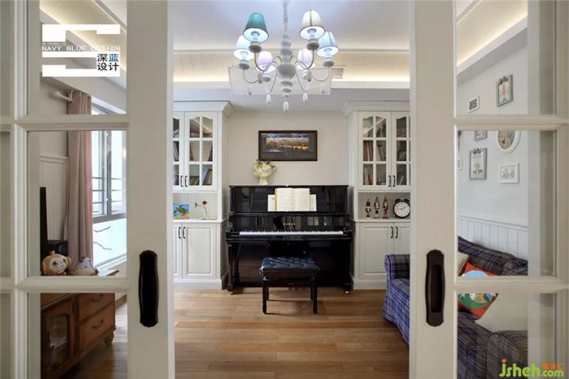 推拉門式的休閑室內(nèi),鋼琴居于視線正中央,兩邊是靠墻的書柜,方便孩子靜心練琴不被打擾,舒服的布藝格子沙發(fā),是孩子們的休息區(qū),還有各式各樣的玩偶擺件引入,打造專屬于孩子們的一方天地。