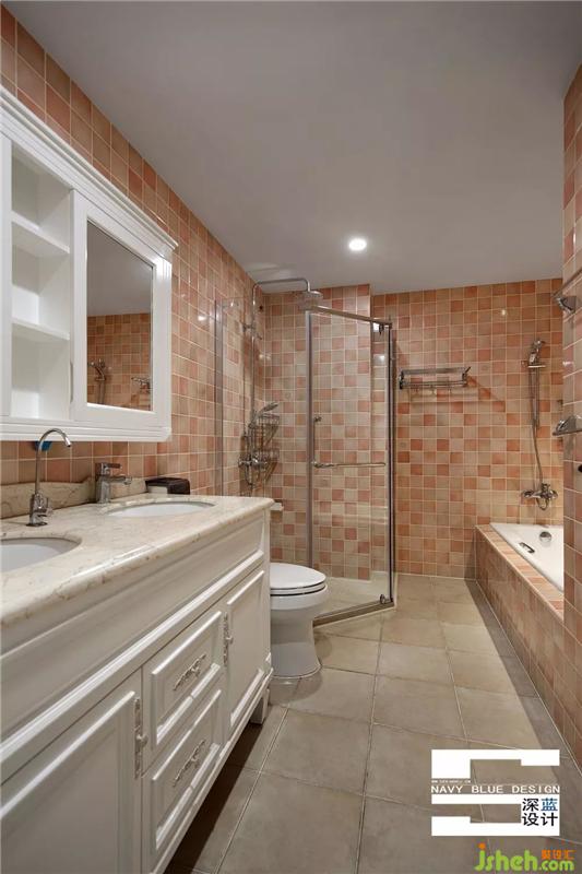 彩色小方塊瓷磚鋪滿整個(gè)墻壁,搭配白色衛(wèi)具,整體給人輕松、舒適的感覺,合理的設(shè)計(jì)空間,滿足了淋浴、泡澡多重享受。