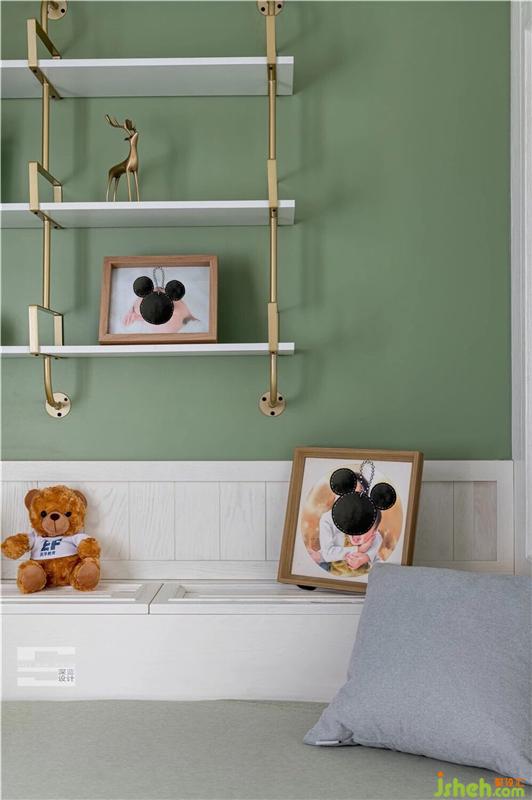 次臥是兒童房,定制的柔和綠色連體書柜書桌組合,造型就像美式小木房子,風(fēng)格簡潔,卻實(shí)用性非常強(qiáng),即可以收納,也可以當(dāng)展示柜使用。