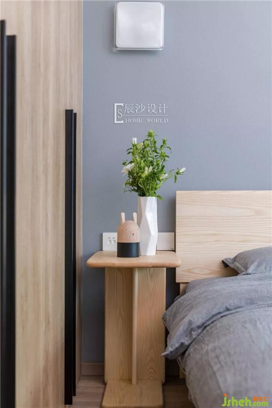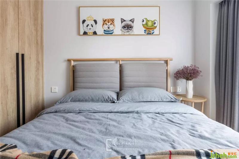 次臥就像一個小森林般自然、清新,原木床搭配淡藍色的床單,一旁的粉色干花,一呼一吸都是那么的柔和。墻上的卡通掛畫就像森林里的動物,空間變得充滿活力。室內(nèi)設(shè)計師