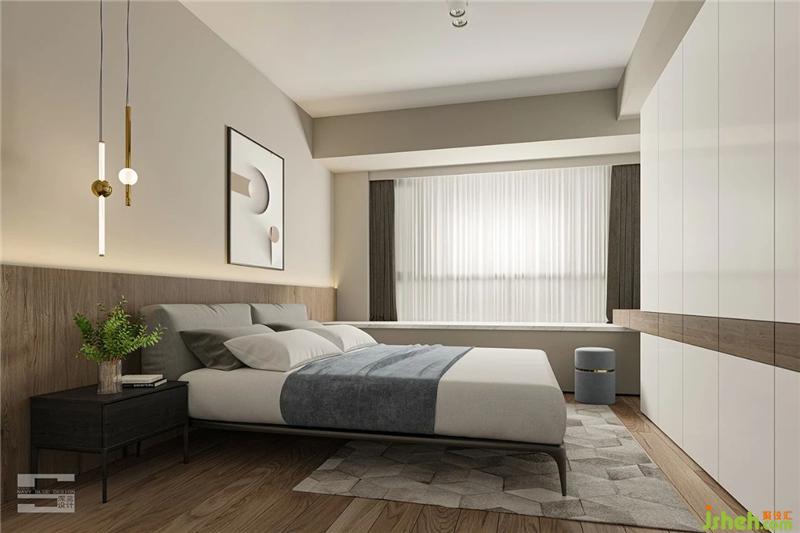 主臥以柔和高級(jí)的淺咖色為主調(diào),自然的原木床頭背景板、布藝雙人床、幾何地毯、具有視覺(jué)延伸的掛畫(huà)、簡(jiǎn)約的床頭吊燈,糅合在同個(gè)空間里,一種舒適自然的氣息油然而生,給人一種成熟、溫暖的感覺(jué)。室內(nèi)設(shè)計(jì)師
