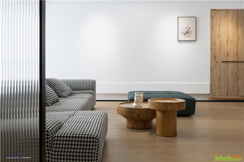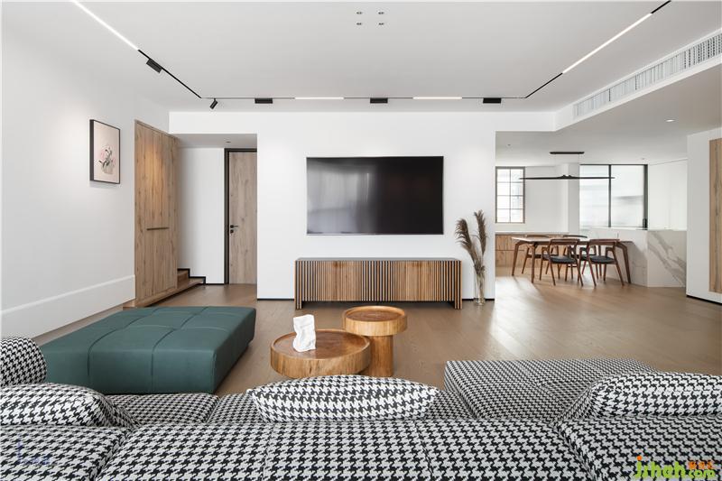 客廳以極簡的線條造型和色塊搭配出來現(xiàn)代休閑的度假式空間。大面積白色和木色形成了空間的主題。沙發(fā)采用千鳥格布藝材質與墨綠色搭配,成為空間的點睛之筆。