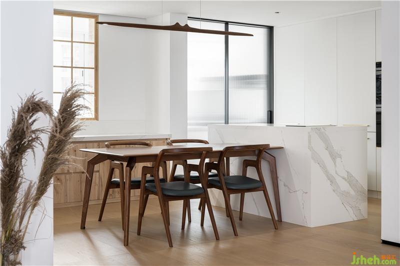 餐廳和西廚融為一體,魚肚白巖板做導(dǎo)臺,和木色餐桌結(jié)合搭配山水主題的餐廳主燈。讓就餐氛圍多了一些自然的溫度。