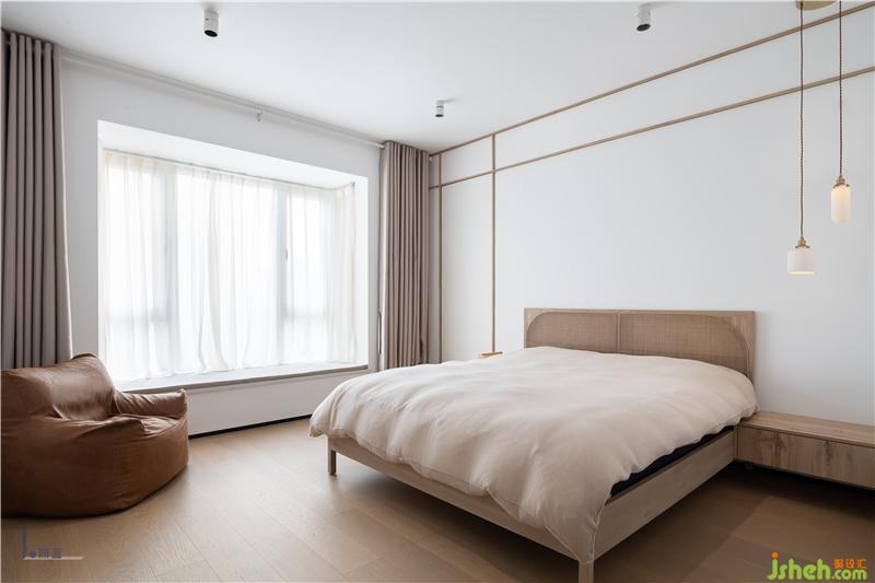 主臥以木色線條勾勒出空間立體輪廓,家居設(shè)計以木色、白色、咖色為主。溫潤的色系讓整個睡眠空間更加安靜平和。藤編的床頭和床頭柜讓睡眠空間更加休閑度假感。