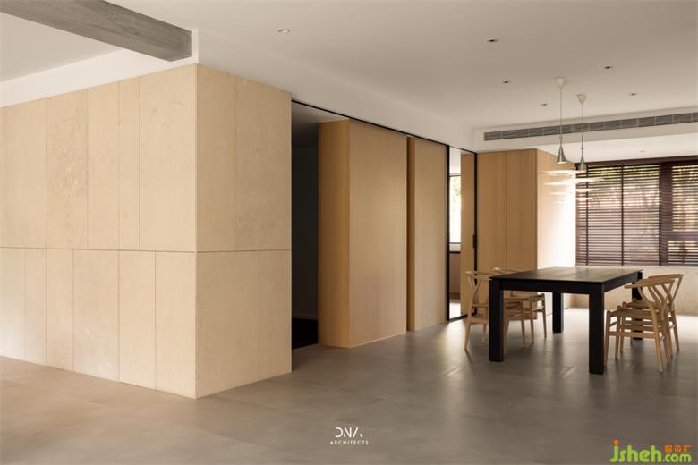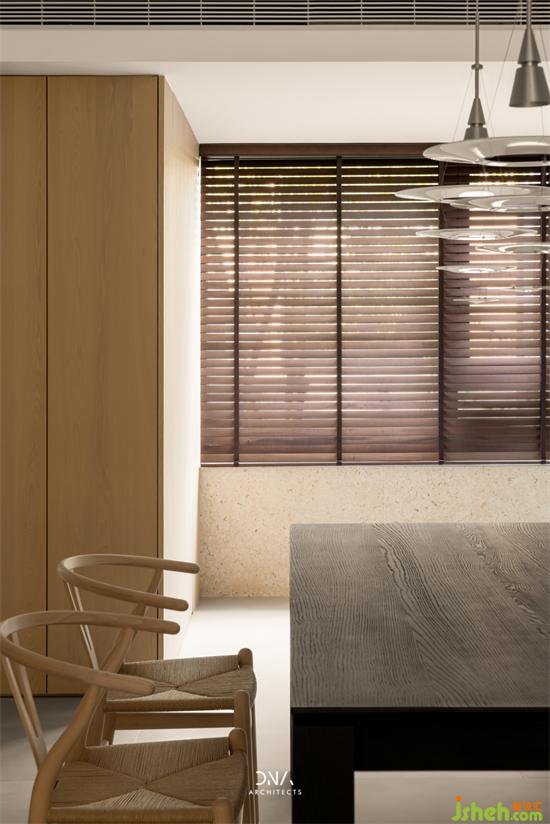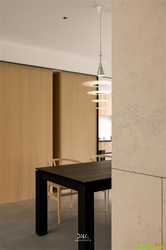 餐廳吊燈是來自Louis poulsen的Enigma 425,它通過不同大小的環(huán)狀,將光源逐步遞進(jìn)到桌面,呈現(xiàn)出柔美的間接照明,其舊房改造設(shè)計(jì)師內(nèi)山昭一一直致力于創(chuàng)造無眩光的間接照明燈具,讓物體變得美麗,讓人們感受舊房改造到物體的質(zhì)感和深度。