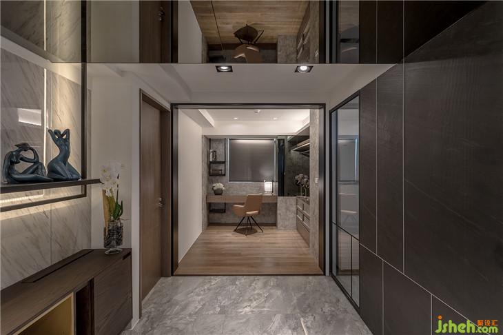 1. 玄關(guān)區(qū)域:采用鐵件、木飾面、燈光作為端景造型