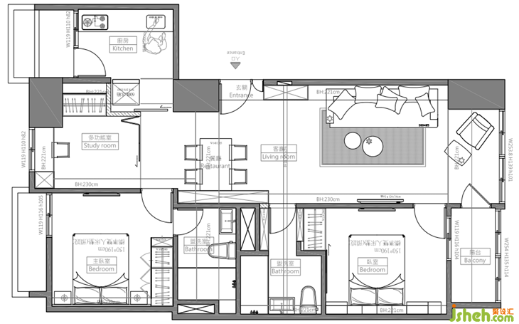 2. 餐廳區(qū)域:餐桌與餐邊柜作結(jié)合,將餐廳空間達(dá)到最大化利用率
