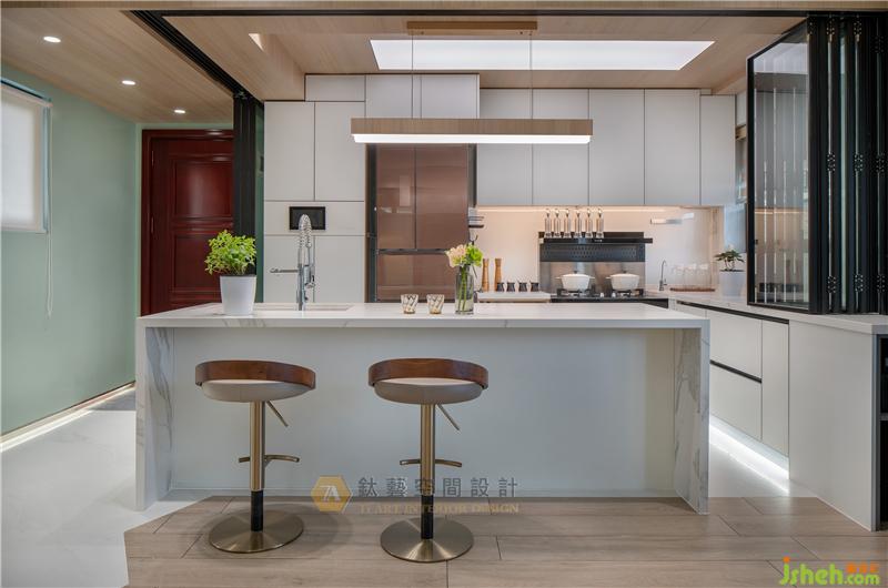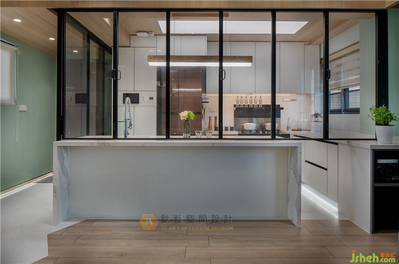 廚房趟門軌道與吊頂有秩序的結(jié)合,同一空間內(nèi)收放自由轉(zhuǎn)換,可封閉、可開放,實(shí)現(xiàn)空間的靈活多變性??臻g的相互流通與連接也將生活的重心擴(kuò)散到整個(gè)住家空間。