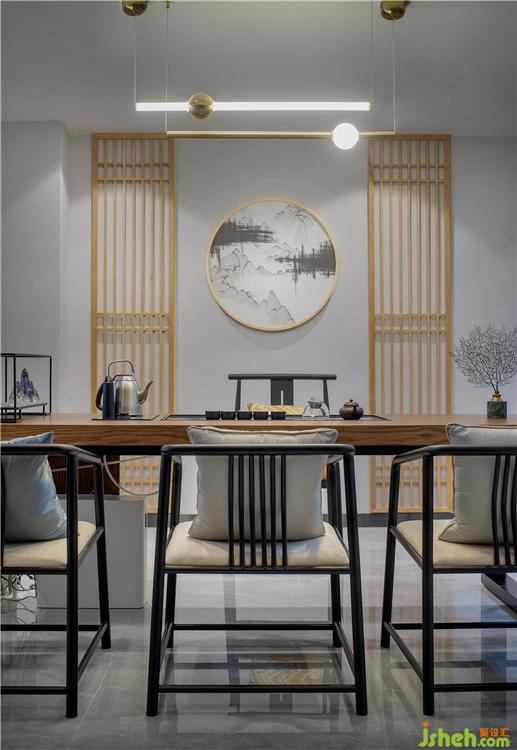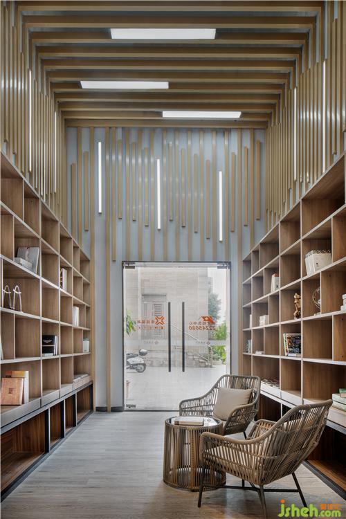 書吧區(qū)域設(shè)計師希望在此營造“私享書房”的自在、愜意氛圍。讓客人暫時卸下生活的疲憊,探尋生活與事業(yè)的新靈感。木色與莫蘭迪灰色系墻面形成整體色調(diào)呈現(xiàn),原木條、皮革、金屬材質(zhì)共同運用為空間自然原始的氛圍營造貢獻(xiàn),增加空間趣味性同時,也增加了訪客停步率,成為一種具有功能性的藝術(shù)裝飾。在日光或燈光的映照下,室內(nèi)大小空間有了表情,明與暗的層次、虛與實的對比、形與影的競走,豐富著空間的意境氛圍。