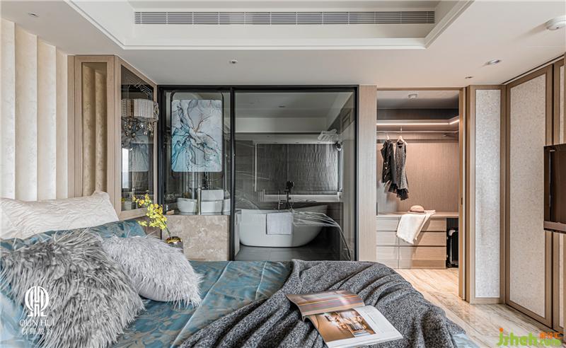 別墅設(shè)計(jì)中,主臥室明確隔間區(qū)分出睡臥、洗浴及更衣三大機(jī)能,其中浴室以清波門片增加采光,換衣間則采用拉門設(shè)計(jì),確保隨心換裝的隱私空間。安排完整體機(jī)能后,設(shè)計(jì)師著手深入細(xì)節(jié),延續(xù)木紋磚地坪的色彩,于滑門電視墻運(yùn)用珍珠母貝薄片拼貼,床頭主墻則以波浪立體造型施以藝術(shù)涂裝,特殊漆面在曲面反射下,使得每個(gè)觀賞角度皆能看到不同的珍珠光彩;臨側(cè)的定制書桌及柜體,采用木質(zhì)搭建并嵌合大面茶鏡,夾敘位于中央的場(chǎng)域要角——床鋪,為淡雅環(huán)境刷上一筆青藍(lán),當(dāng)每晚床頭燈亮起,便又完成一處剔透的夢(mèng)幻場(chǎng)景。