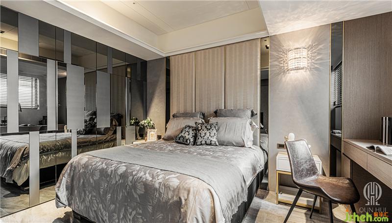 兩間次臥房運(yùn)用相應(yīng)手法配合迥異的家飾細(xì)節(jié),勾勒出各自的空間性格。兩處臥床上方皆以挑空設(shè)計(jì),搭配整體的雅致配色,別墅設(shè)計(jì)營(yíng)造輕盈無壓的睡前視野。而不同之處在于一者選用藝術(shù)涂裝基底,搭載線板語匯的雕花家飾使場(chǎng)域趨向典雅,此外亦回應(yīng)使用者習(xí)慣,規(guī)劃直立式鋼琴及通透置物柜滿足所需。另外一間次臥房則收斂繁復(fù)樣式,以簡(jiǎn)單線條建構(gòu)干練視感,并在此概念下,于衣櫥門片貼設(shè)不規(guī)則的矩形灰鏡,扣連場(chǎng)所主題,同時(shí)拉伸側(cè)向空間感,大力展開敞朗的私人視野。