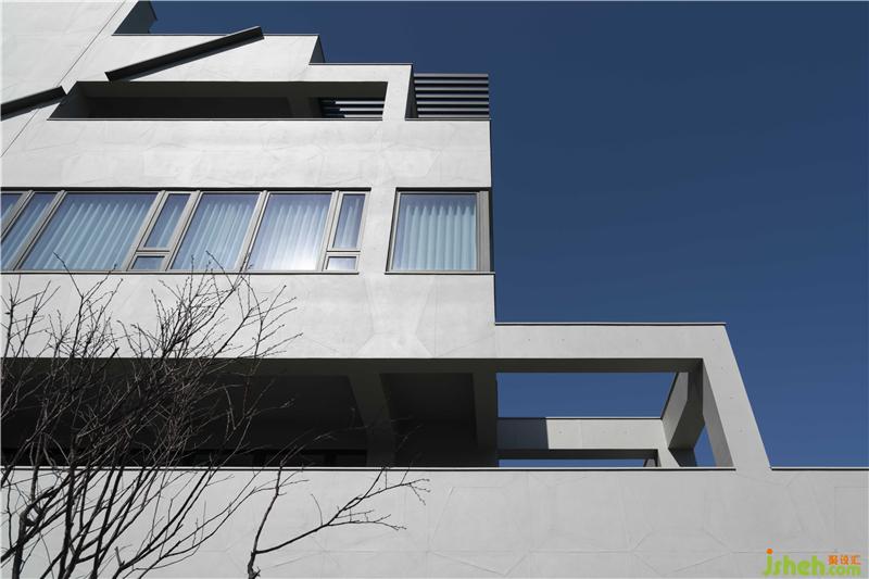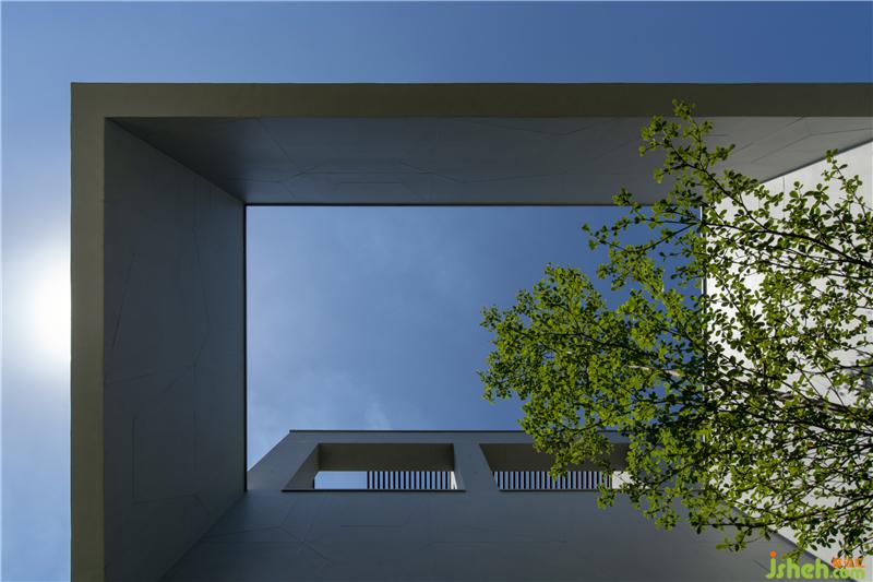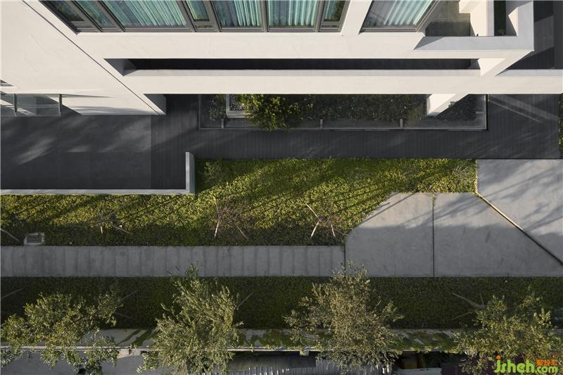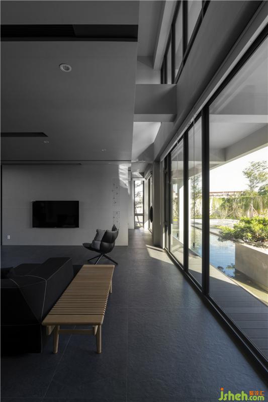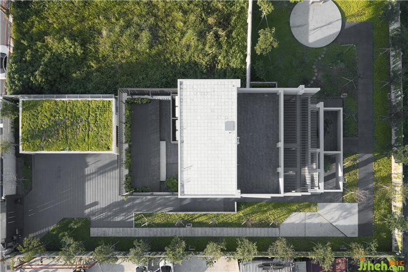 在綠意之內(nèi),以清水模為材質(zhì)的幾何狀外觀,內(nèi)斂并和善地與環(huán)境互動(dòng),讓四時(shí)遞嬗隨著清新空氣,滿布整個(gè)量體當(dāng)中。