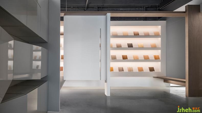 The biggest challenge of retrofit design is the consistency of the cabinets. The site and limited space of two rows of cabinets should be keep in the same after reform. We try to mix the flexible and rich streamlines and the various of products by this way. Firstly change the way of“walk-in-bending”when enter the room, oppositely, extend the entrance long to make the feel of mystique and sense of ritual and shorten the gray space door to 800 which connected with the entrance which can be a strong contrast. And then using the skill of decoration, via the combination of white walls and wood veneers, using the original columns as the supporting stuff, and the walls----thick-thin and seems moved angles to weaken the sense of customers to the original space. When it done will let products seems like born in the hall, not the separated parts of the space. This, break the traditional fixed formula---only knows to shoot all lights on the products.