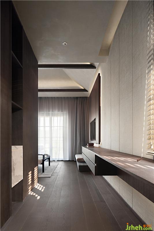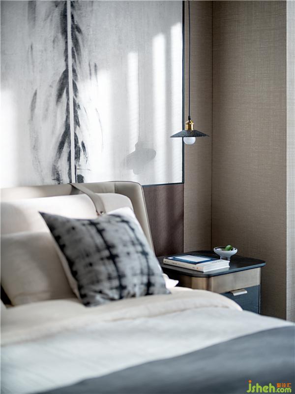The master bedroom still continues the linear space moving line, the palm wood floor is combined with the beige and hemp wall, and the Japanese hand-painted silk painting at the head of the bed skillfully outlines the sense of space hierarchy. Living life and the natural response outside the window make the clean, simple and plain base more energetic and vital.