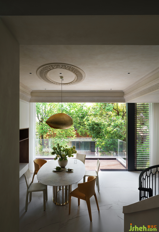 成都別墅設(shè)計(jì)以橢圓元素為主的主餐區(qū)既圍坐親和,又不像正圓餐桌那樣的正式。樓梯處的綠色墻體有著大自然皮膚一樣的肌理,與橢圓鏡子里映射出的自然、戶外真實(shí)的綠意形成呼應(yīng)。