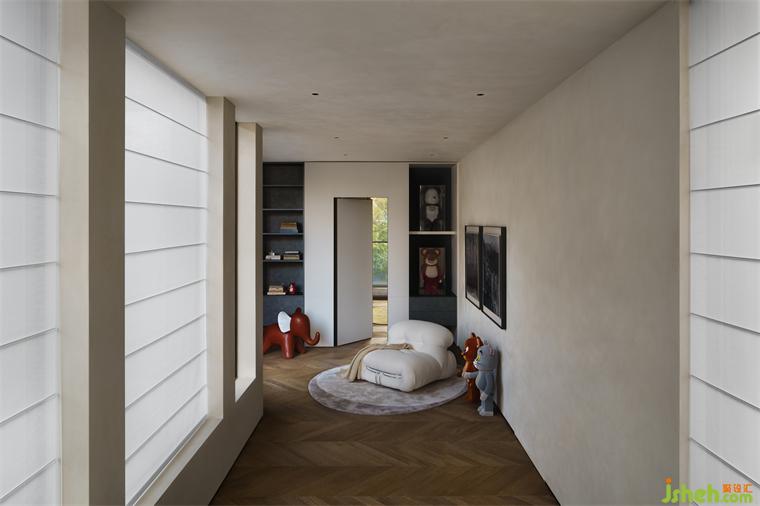 三層生活空間有著比一、二層更多的攝影和藝術(shù)品,其中,攝影都是男主人的生活習(xí)作與記錄,凝固著自己和家人體驗(yàn)過的畫面。設(shè)計(jì)師將此作為裝飾家的藝術(shù):將其散落布置在家的各個(gè)角落,畫框里放進(jìn)了往日存在,休息的時(shí)候就像休息在自己的往昔時(shí)光里,這樣就能輕易的獲得舊夢重溫的美妙。