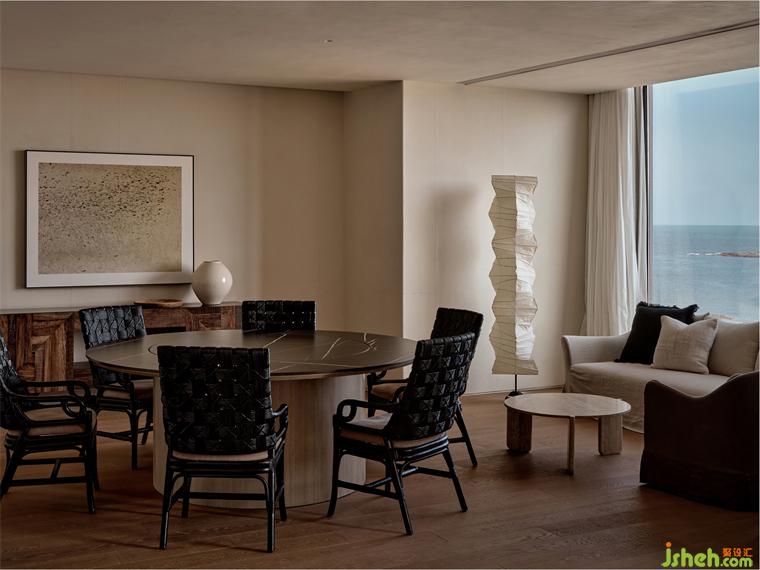 酒店設計延伸并保留至大堂的原始礁石,是被自然賜予的禮物,成就了空間的氛圍主題,通透的弧形場域,為人在進入的那一刻,感受時間沉淀的靜謐,設計將重點放在結構和材質上,縱向分隔的樓梯成為一組打開的畫卷,大體量的石塊成堆疊之勢,與海灘的天然礁石形成對話。石柱、石材、礁石形成新的秩序,保留check-in的功能之外,以退隱的方式凸顯質樸的自然,站在窗景前,如同泉州三灣向大堂展開擁抱,人們在此尋找庇護和獨處,收獲巨石之下肅穆的詩意之美。