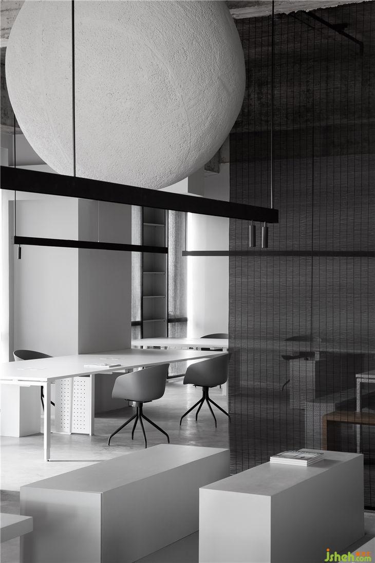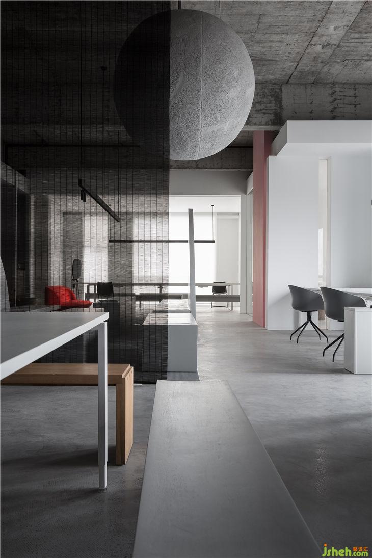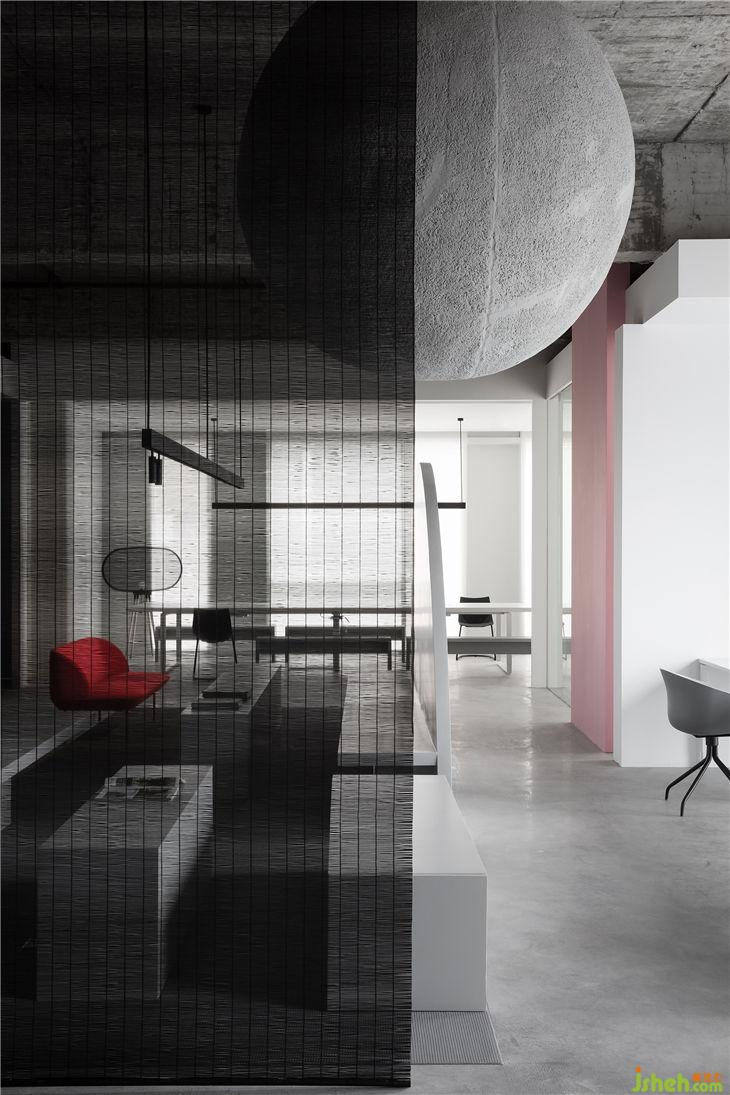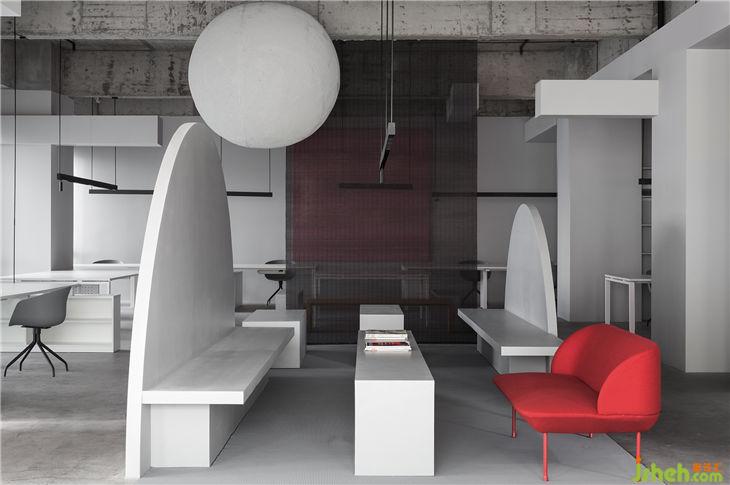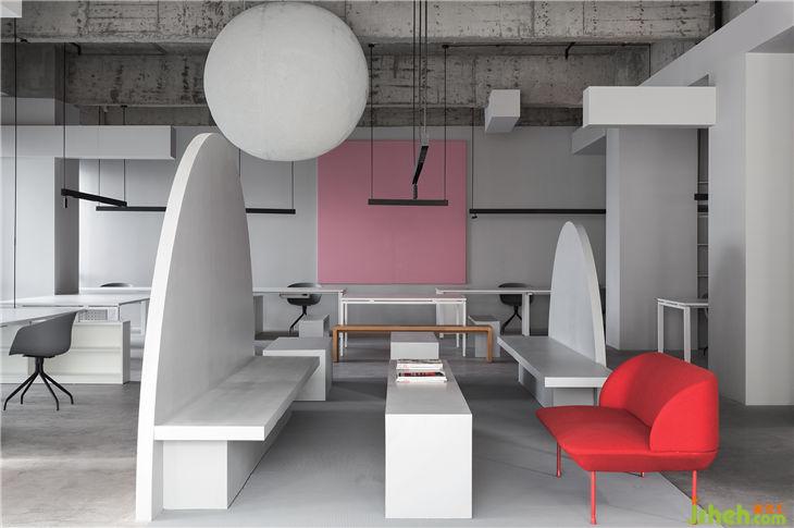在空間整體冷靜色彩的提煉中,具有無(wú)限張力的留白處理,是設(shè)計(jì)師的克制處理。跳脫的紅與粉,就像是這未知空間中躁動(dòng)的原點(diǎn)。白本身處于色界的極端,在這界線分明的空間中,會(huì)議區(qū)成了克制的純與空,紅色沙發(fā)與粉色板塊的激進(jìn)表達(dá),完全拋開(kāi)了界的比例,對(duì)比鮮明。從色界極端入手,除了大膽的嘗試,克制與躁動(dòng)的較量,還交織著與情緒相輔的空間感受,引發(fā)人的行為特征,促進(jìn)情感交流、思想碰撞。