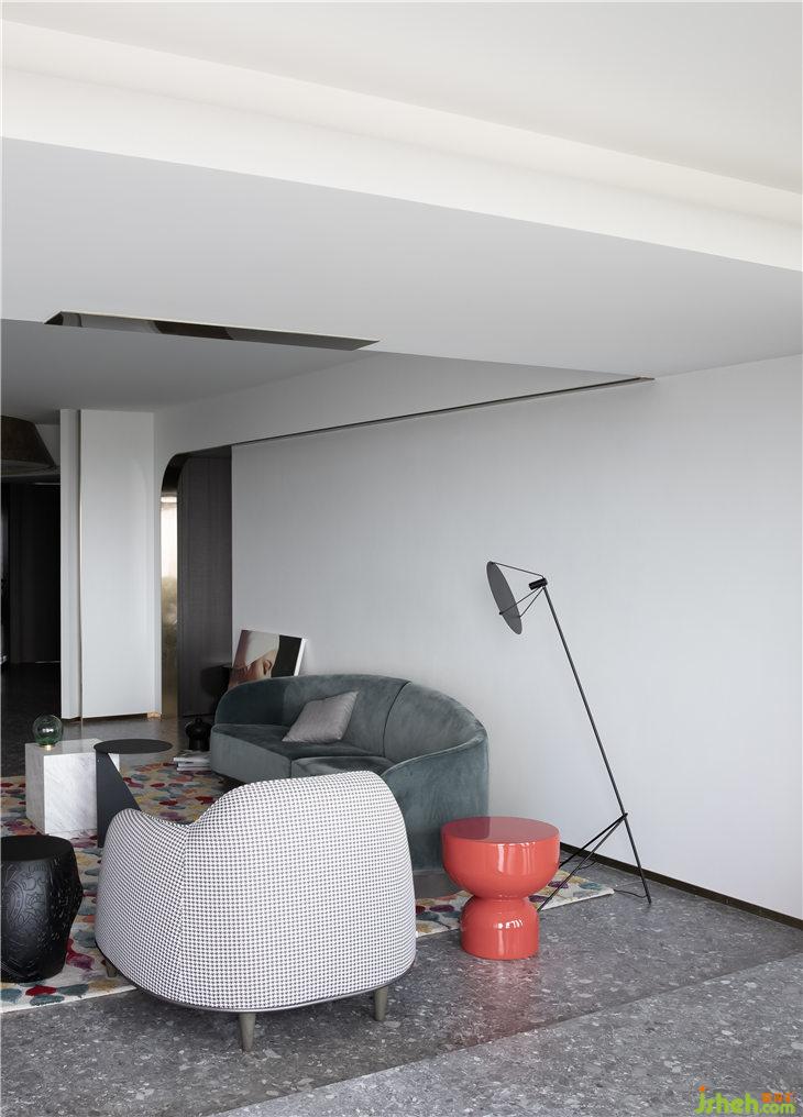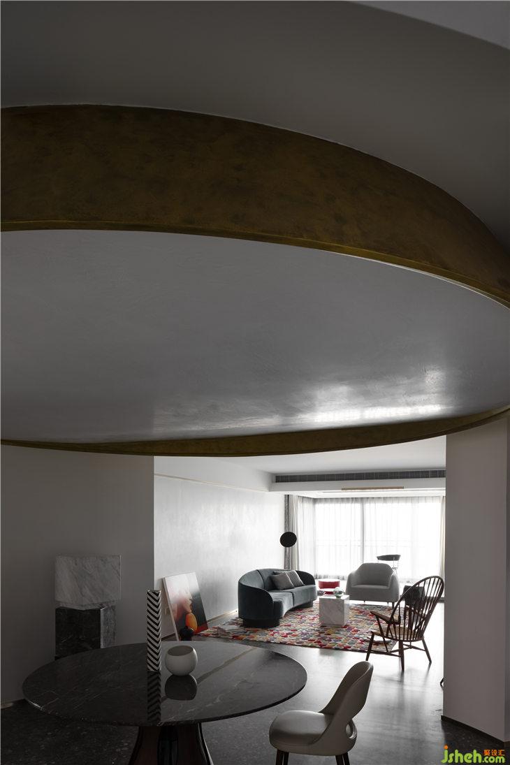 客廳空間立面以白色的藝術漆為底,立面的弧線線條來呼應餐廳的圓形,強調(diào)空間的線與面的關系,通過弧形線條重塑空間的構(gòu)成美學。深灰色水磨在居家空間的運用,更加彰顯空間的獨特。平天花更好的突顯餐廳圓形的天花線條,同時有力的拉升了高挑的空間感。餐廳與客廳一氣呵成,互相融合。構(gòu)成一個熱鬧的大家庭。我們可以想象人與人之間其樂融融的生活情景。黑色的QEEBOO骷髏邊桌,色彩斑斕的土耳其進口地毯等軟裝配飾,無一不是在強調(diào)空間的俏皮與精神性。