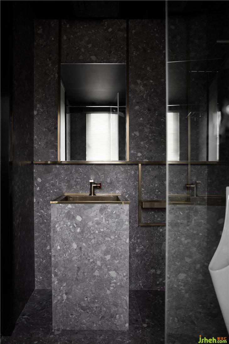 浴室以灰色水磨為底,金色不銹鋼為構(gòu)成要素,定制的手工不銹鋼盆,強(qiáng)調(diào)設(shè)計者對設(shè)計細(xì)節(jié)執(zhí)行的追求。
