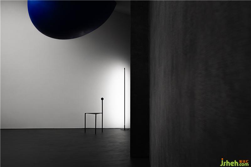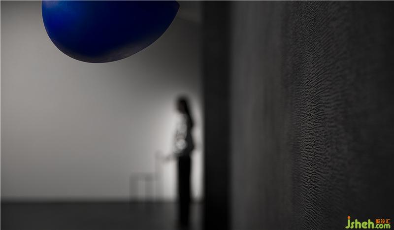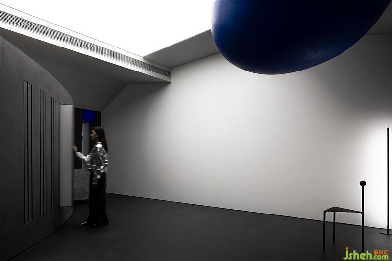 空間通過(guò)球體劃分了一個(gè)彈性的空間,這個(gè)場(chǎng)域人是空間的主體,沒(méi)有被圍合卻擁有最強(qiáng)場(chǎng)所感的區(qū)域,一個(gè)人與空間能交流的場(chǎng)所,自由的空間。裝修設(shè)計(jì)采用藍(lán)色,并與前臺(tái)的藍(lán)色相互平衡,讓兩者有一種孤獨(dú)的對(duì)話(huà)的情緒。用嚴(yán)謹(jǐn)?shù)膸缀沃刃騺?lái)構(gòu)建感性的場(chǎng)域,矛盾與協(xié)調(diào)的構(gòu)筑。