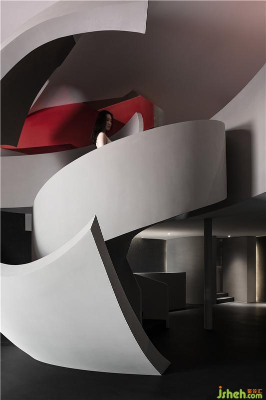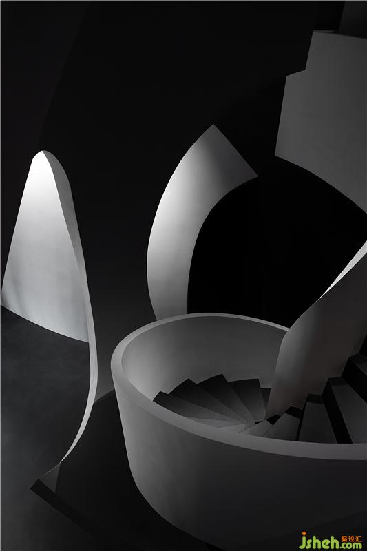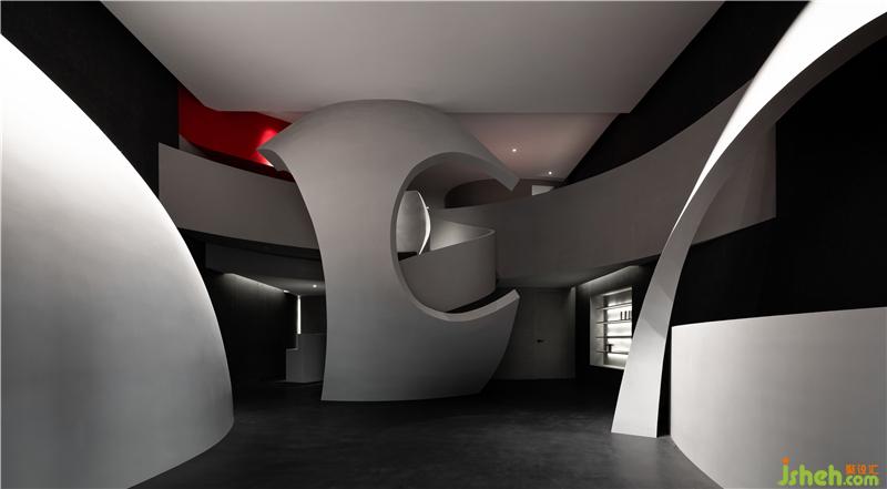 進(jìn)入空間,曲線與直線的組合架構(gòu)大型的幾何體量,厲冷的混凝土協(xié)作塑造強(qiáng)烈的沖擊感。視覺(jué)上線條的延伸交織,內(nèi)含人體細(xì)胞流動(dòng)的本質(zhì),當(dāng)進(jìn)入者緩緩而行,靜與動(dòng)的相對(duì)情境才開(kāi)始發(fā)揮作用。