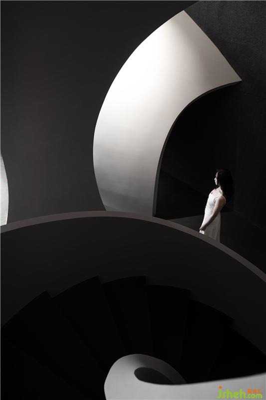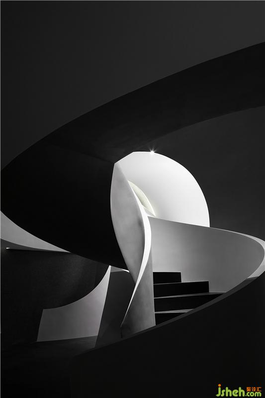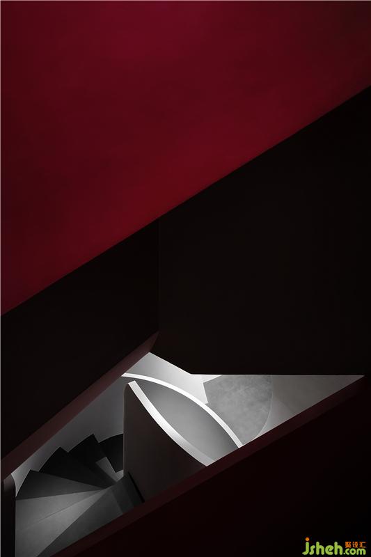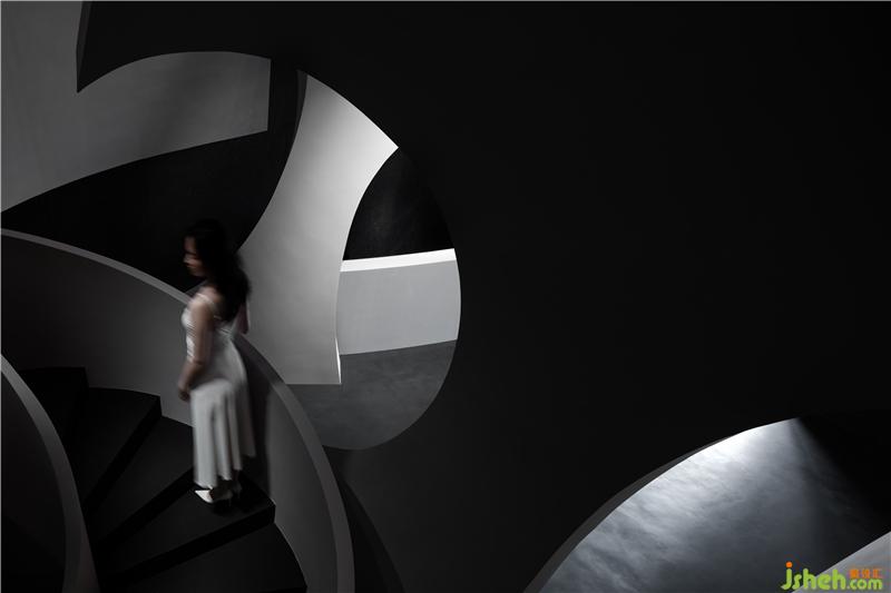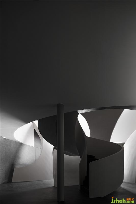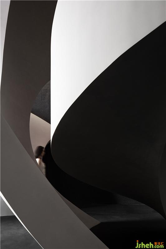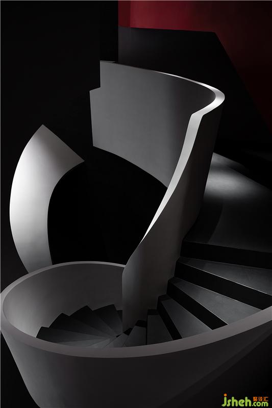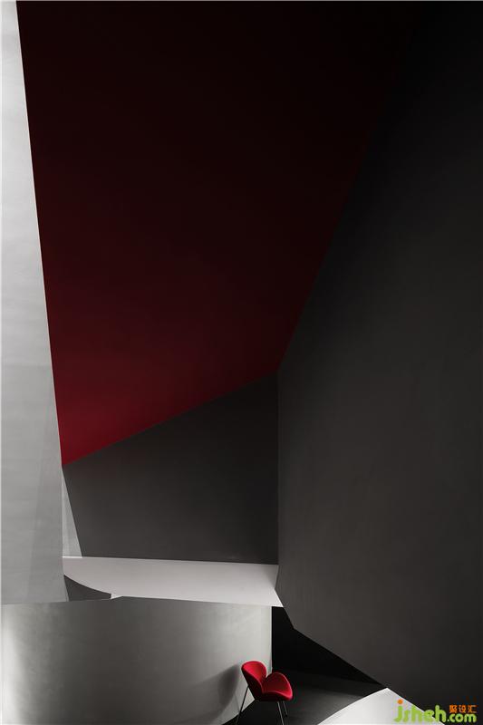 灰色與黑色鋪構(gòu)的空間基底中,暗藏一抹熱烈的“紅色”,色彩上的突變,成為空間造型之后引爆空間張力的第二個(gè)高潮。色彩應(yīng)用的巨大反差極具引導(dǎo)性,同時(shí)為進(jìn)入者留下深刻的印象。