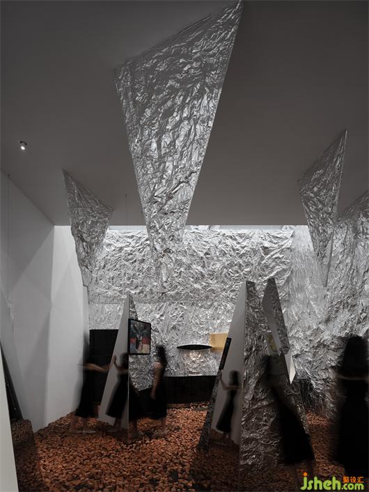 展覽設(shè)計(jì)考慮到觀展的人流密集,設(shè)計(jì)通過(guò)三角形來(lái)分割空間,創(chuàng)造一個(gè)擁有自由度的同時(shí)擁有方向性的情景,其目的是更好的讓看展覽的人更好流動(dòng)起來(lái),讓本該固定的觀展流線變得自由并且節(jié)奏豐富。