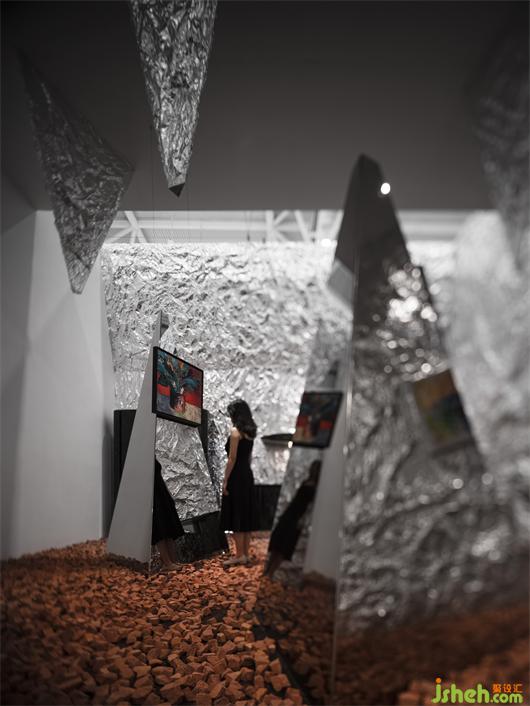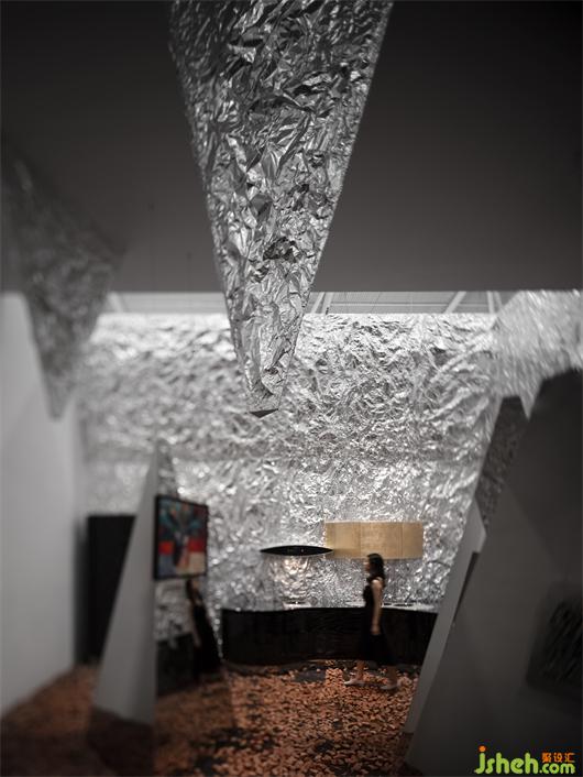 在整體的展覽館中,琳瑯滿目的產(chǎn)品與空間設(shè)計,作為觀展者,一天看了無數(shù)的產(chǎn)品與展覽館,如何讓流水線中的人產(chǎn)生記憶點,獲得意外。地面的紅色丹霞碎石給人觀展的過程產(chǎn)生危險與意外的信號,這是在視覺以為所獲得的體驗。展覽設(shè)計這種體驗是可以直接刺激我們的大腦的。而墻面的褶皺金屬質(zhì)感,通過視覺的沖擊,吸引人的感觀。特殊定制的玻璃更是讓空間產(chǎn)生豐富的錯解與層次,讓人產(chǎn)生探索的欲望。所有的這一切都在用最強烈的聲音來反饋到人的身體,在體驗上產(chǎn)生意外的驚喜。而最終的目的都是在解決商業(yè)上如何產(chǎn)生高效的流量與記憶。
