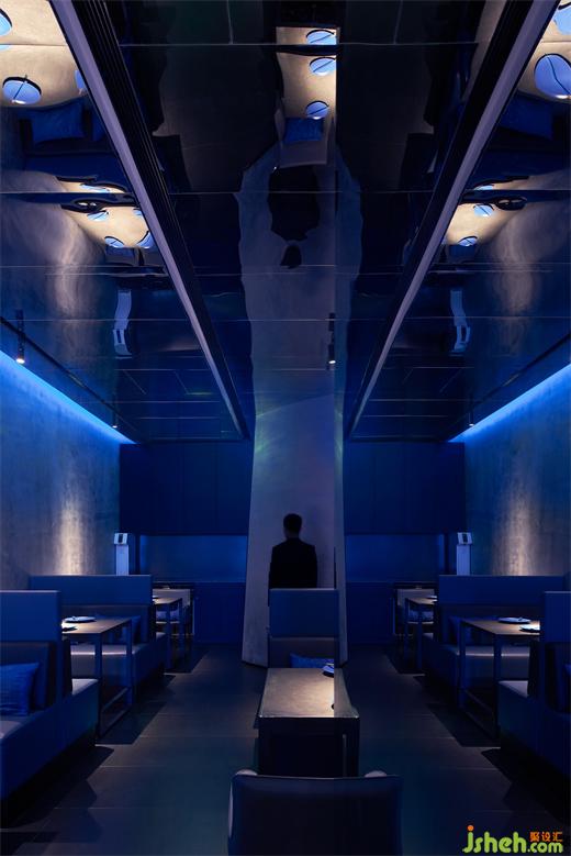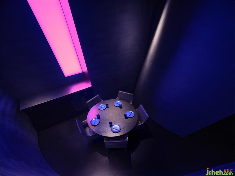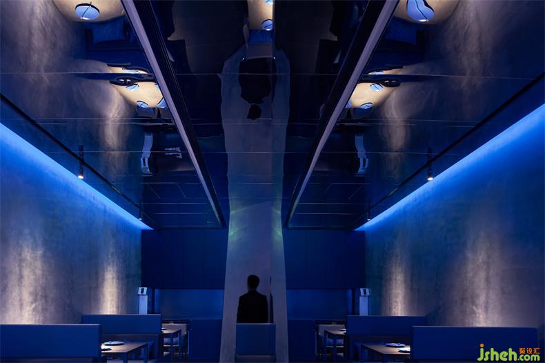 迷幻波長(zhǎng)的冷調(diào)藍(lán)光隱現(xiàn)在充滿險(xiǎn)象的體塊情境中,藝術(shù)餐廳設(shè)計(jì)微妙的光影讓空間帶來(lái)喘息和微醺曖昧的情愫,對(duì)比反差的玫紅色霓虹燈光與餐吧空間高度的鏡像,形成強(qiáng)烈的色彩與光影對(duì)比,其魅惑的力量,為觀者創(chuàng)造了一個(gè)迷幻體驗(yàn)情境;最終形態(tài)是一種自由的、魔幻的,激進(jìn)的藝術(shù)氛圍。