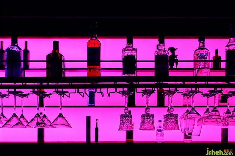 吧臺(tái)區(qū)域的情緒,迷幻的光影設(shè)計(jì)也更加大膽與大面的鋪陳,其目的是為了將場(chǎng)域情緒的力量擴(kuò)大化,其爵士與朋克的內(nèi)在精神力量迷幻,熾熱的流動(dòng)在空間,但又緩慢悠揚(yáng)且激進(jìn)的浪漫節(jié)奏。