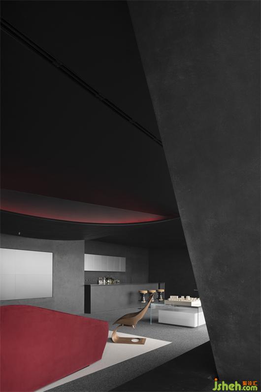 暗黑色系的辦公室,這是一個(gè)具有爭(zhēng)議的狀態(tài),另我們驚喜的是,這樣的暗黑系,辦公會(huì)所設(shè)計(jì)更好地將視覺(jué)引到室外的美景,更好的與自然進(jìn)行互動(dòng)。簡(jiǎn)潔的材料體系,黑色洞石的效仿意大利藝術(shù)漆,體現(xiàn)了空間的份量感,德國(guó)芬尼特地毯的運(yùn)用,強(qiáng)調(diào)了舒適度、吸音及特殊的地面質(zhì)感,不銹鋼與燈光的結(jié)合,強(qiáng)化了空間的科技感與場(chǎng)景感。