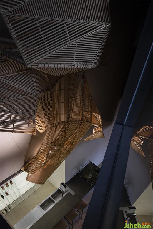 金色的電動門緩緩移動,進(jìn)入我們視野的是前臺接待與水吧功能結(jié)合的多功能服務(wù)區(qū),發(fā)光的玻璃酒柜,顯得輕盈又具有高級感。深圳餐廳設(shè)計(jì)接待臺前方的陣列木盒子,有效的強(qiáng)調(diào)了大廳的私密性用餐體驗(yàn)的同時,產(chǎn)生了強(qiáng)烈的建筑秩序感,吧臺頂部用當(dāng)代的幾何造型與手工的編制木手藝進(jìn)行碰撞,圍合出了讓人具有探索欲望的空間情境。