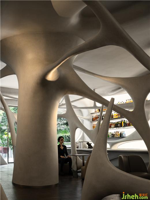我們正在努力去洞察環(huán)境的基因,然后試圖去破解,在城市的基因中制造分裂,重新組織新的肌理。Tan90°酒吧設(shè)計(jì)在空間設(shè)計(jì)本身之中內(nèi)部具有自由性,空間更像是未來(lái)的機(jī)器的心臟,會(huì)在不同的情景中運(yùn)作起來(lái)。空間的流動(dòng)感與人產(chǎn)生對(duì)話,形成了動(dòng)態(tài)的場(chǎng)景組織,而空間反饋給人的這種意念也是空間記憶的一部分,它可以是洞穴,太空艙,神經(jīng)元等等,但這一切都離不開(kāi)白天咖啡的一種適度與晚上威士忌輕微躁動(dòng)的切換。