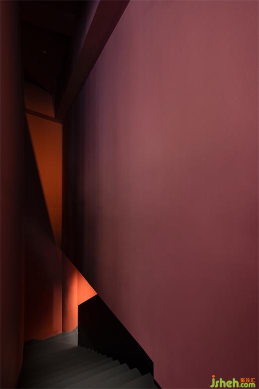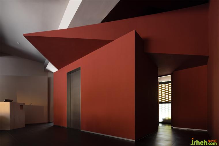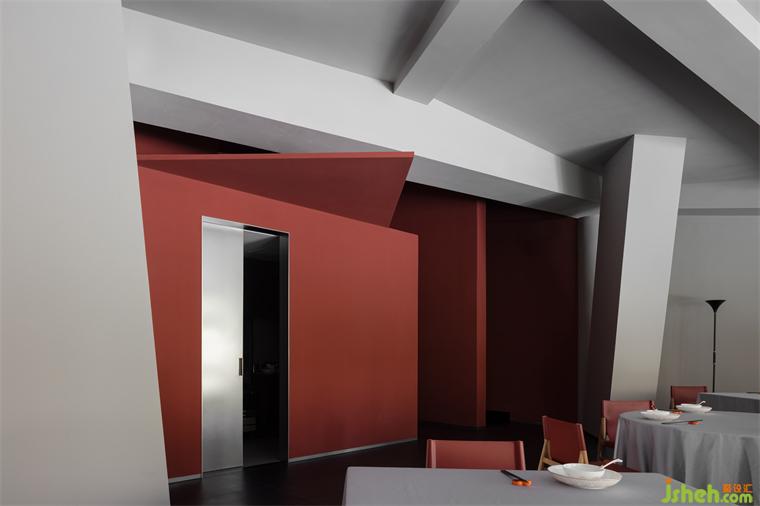 Passing through the winding path, the guests will encounter the restaurant entrance. The space design emphasizes the connection with the outdoor garden landscape and corridor, and creates a strong color contrast with structures as the media. The entrance elongated by the corridor and columns becomes narrow and long, which creates a slow-motion illusion. The hall is defined by red wall coatings and a restrained scale of structures, where the block, plane, line, and lighting are interpreted as geometric expressions from a structuralist perspective to the greatest extent.